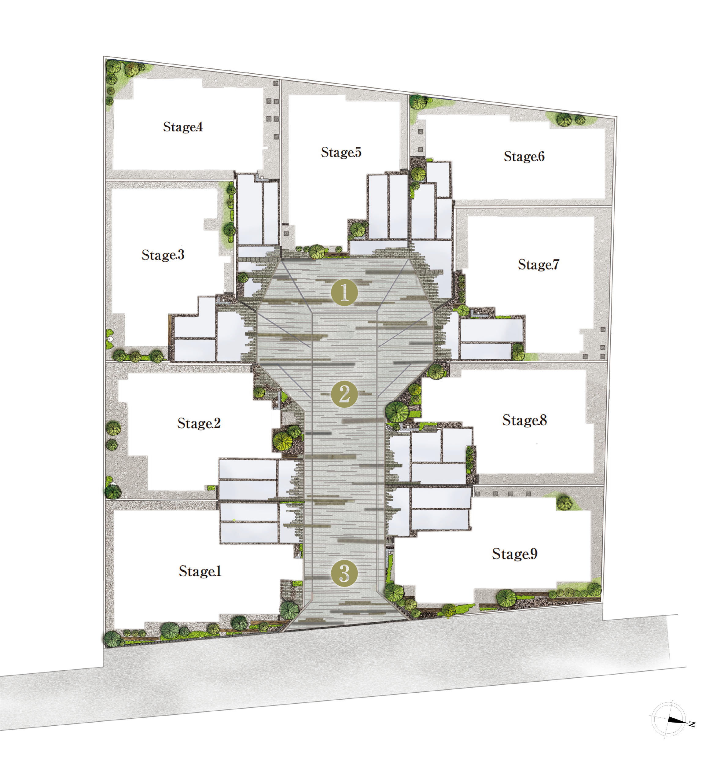 街づくりにおいて景観形成に重要な植栽は、各棟ごとに異なるプランニングを。美しい緑色の葉で知られるシラカシやソヨゴ、ヤマボウシなどメインツリーをはじめサブツリーもそれぞれ異なるセレクトに。街全体の美しい調和を図りながら、各邸の外観に一層と映える計画としています。