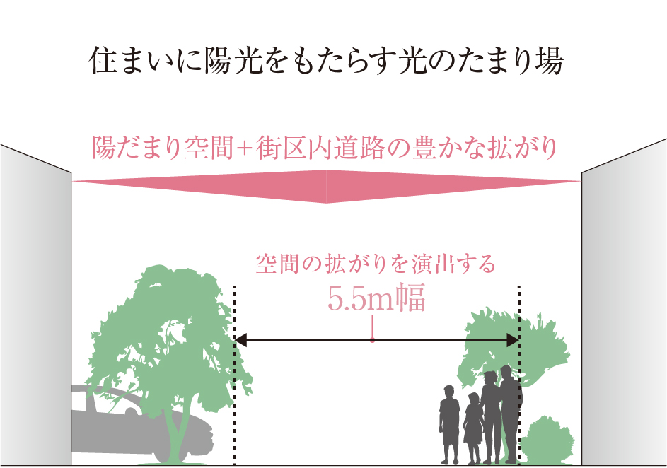 街区の道路は両脇にプラスアルファのスペースを設けることで5.5mの幅を確保。歩きやすさと空間の拡がりを演出しています。