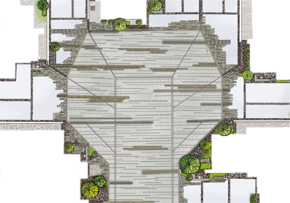 道路の奥が行き止まりで、車のUターンを促す転回広場「センタープラザ」。街の景観を彩るインターロッキング舗装により、石畳を歩くような軽快なリズム感が生まれます。
